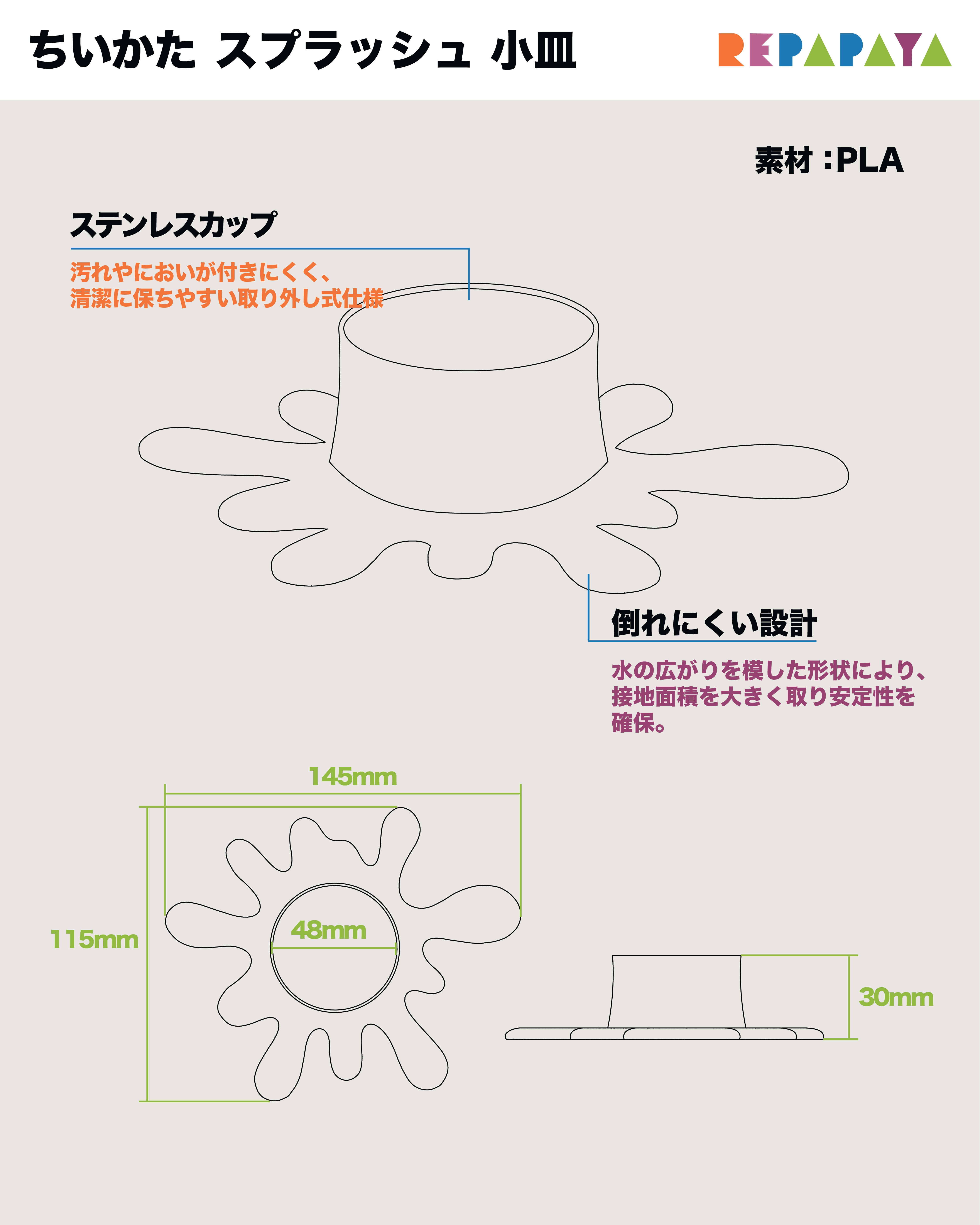 『ちいかた』シリーズおよび『あそびば』シリーズの一部製品とおそろいカラーで展開する、スプラッシュ型の餌・水用小皿です。全7色展開で、『ちいかた』Bowタワーや『あそびば』シリーズのCone/Hillシェルターと、統一感のあるレイアウトをお楽しみいただけます。