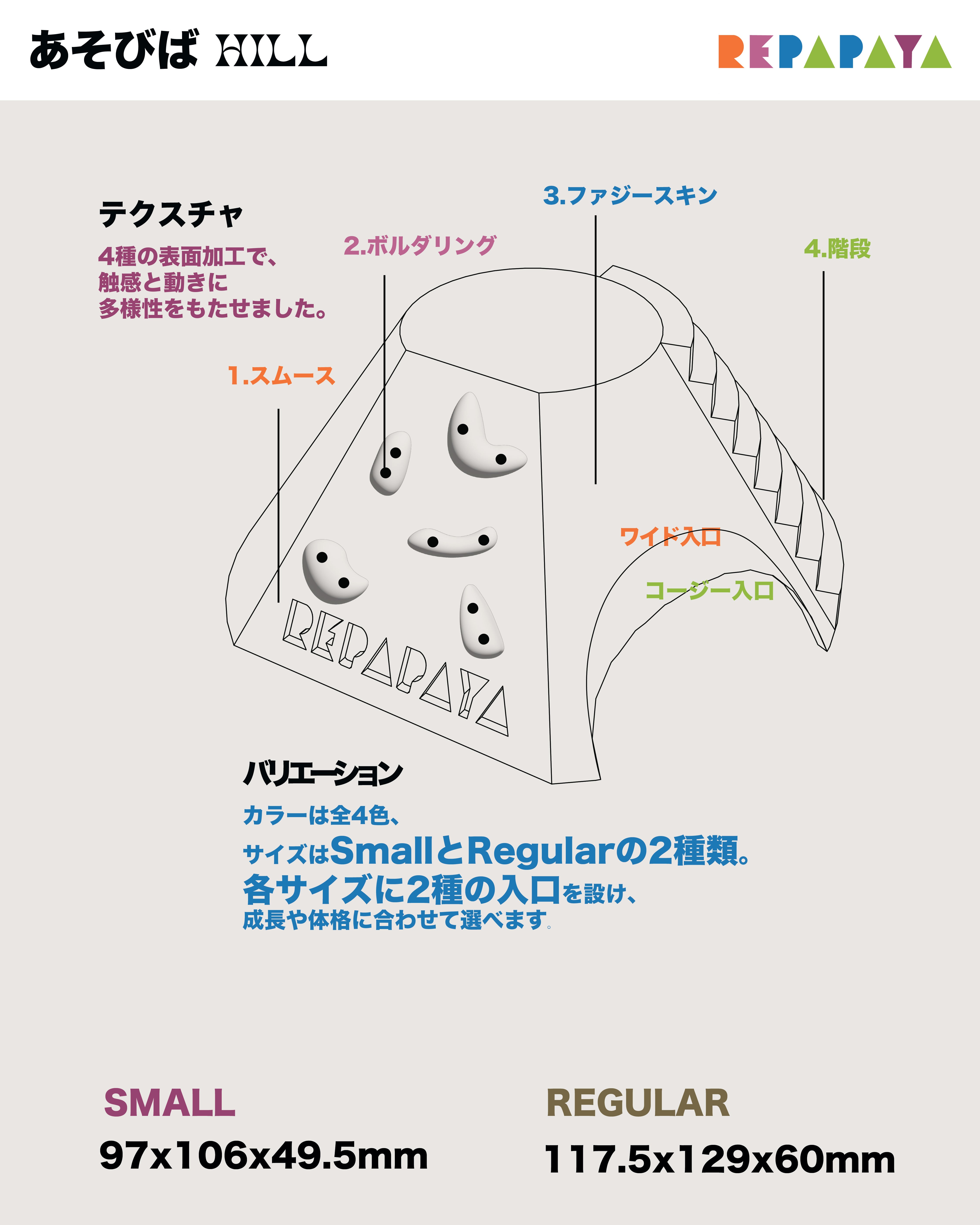 表面には4種の異なるテクスチャ(ボルダリング/階段/スムース/ファジースキン)を施し、触感と動線の多様性を持たせました。素材はすべてPLA製。軽量でありながら安定性が高く、清潔な印象を保ちながら設置できます。