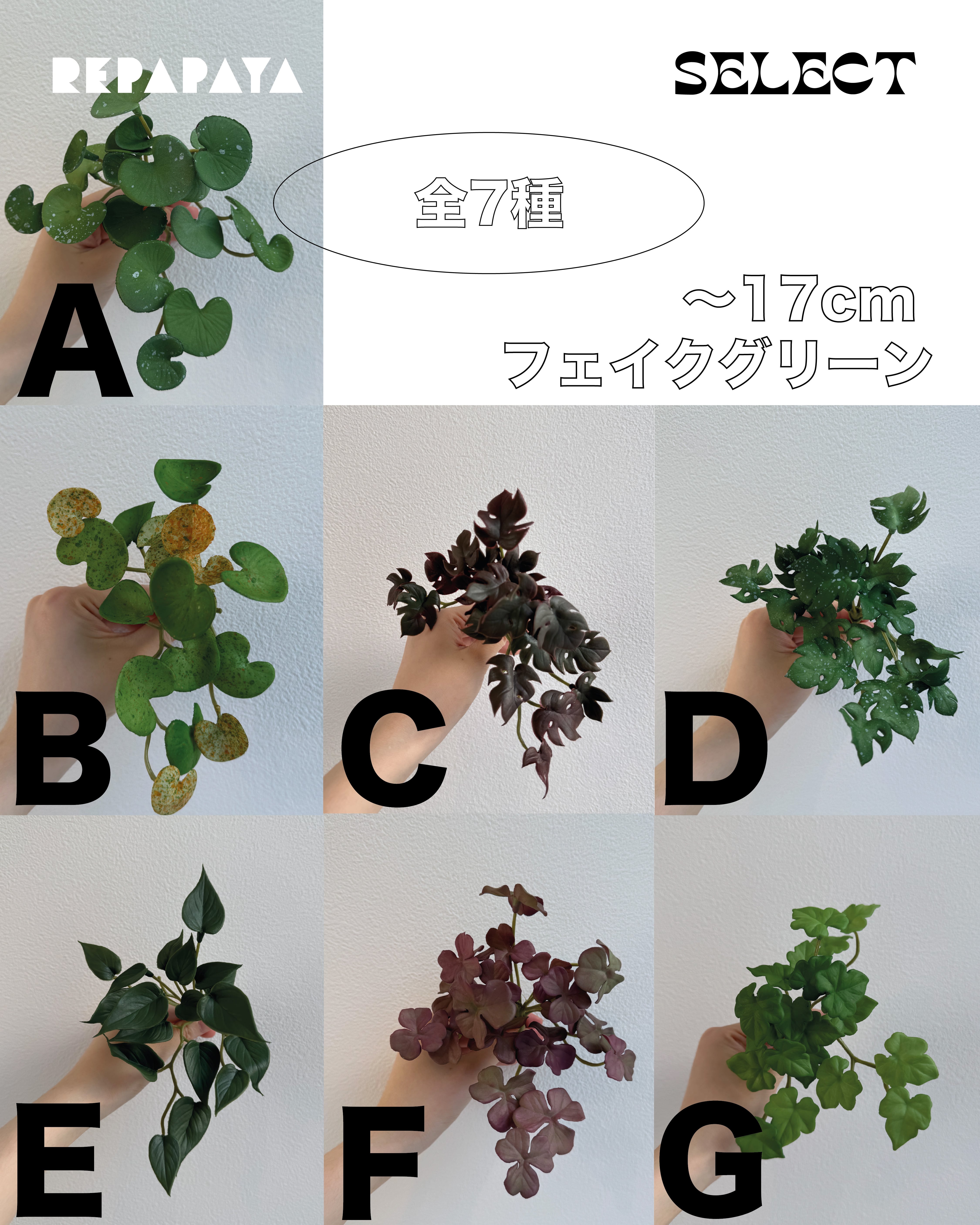 ・フェイクグリーンは全7種類をご用意しております。商品画像をご確認のうえ、ご希望の種類をオプションよりお選びください。
